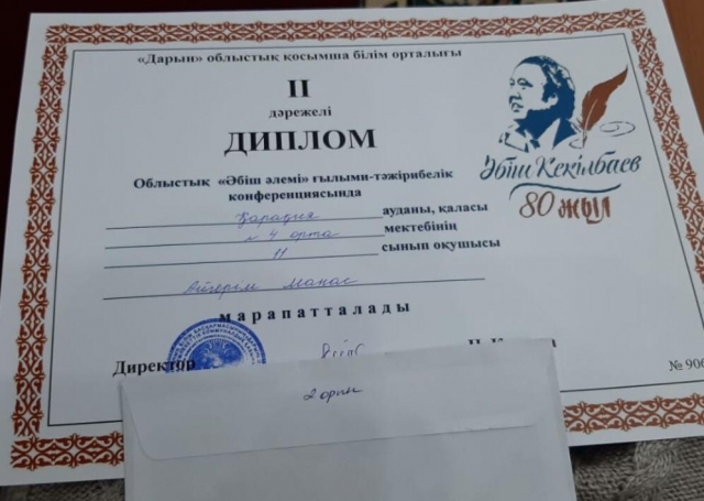 Аудандық білім бөлімінің жоспары негізінде 2019 жылы 29 қараша күні №5 орта мектеп базасында "Әбіш әлемі" аты ғылыми-тәжірибелік конференциясының аудандық кезеңі ұйымдастырылған болатын. Облысқа жолдама алған № 4 орта мектебінің 11 сынып оқушысы Манас Айгерім мен Құланды орта мектебінің 9 сынып оқушысы Құрманбай Сая, бүгін 03 желтоқсан күні облыстық тарихи-өлкетану мұражайында өткен облыстық кезеңінде де топ жарды. Манас Айгерім жүлделі ІІ орын жетекшісі Нұрым Жаннат, Құрманбай Сая ІІІ орындарды жетекшісі Башигулова Инкар иеленді.