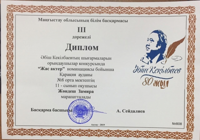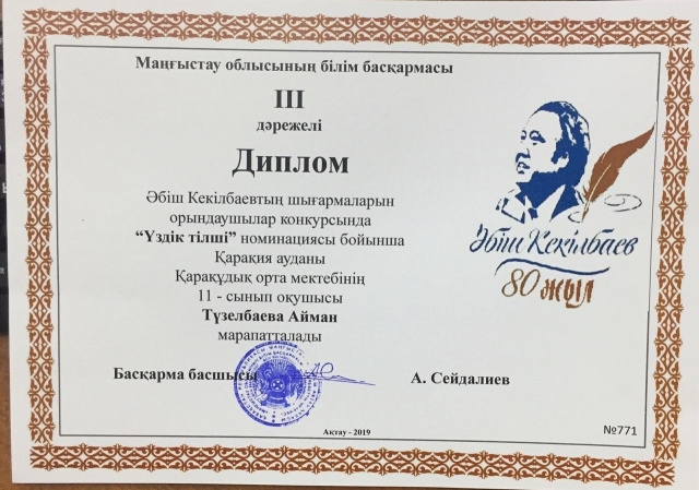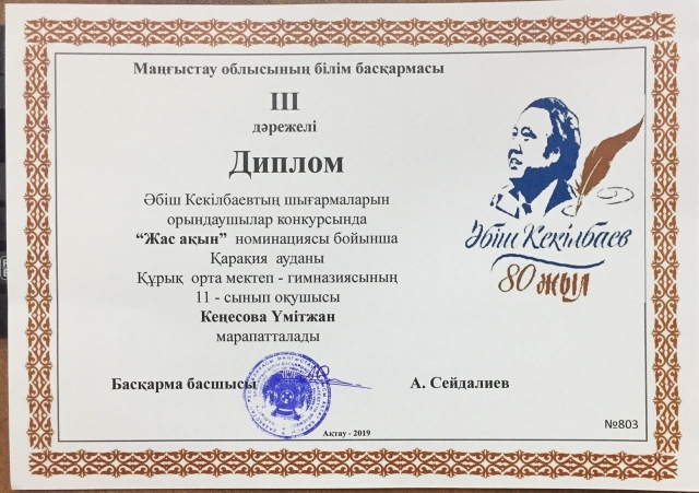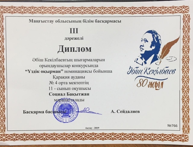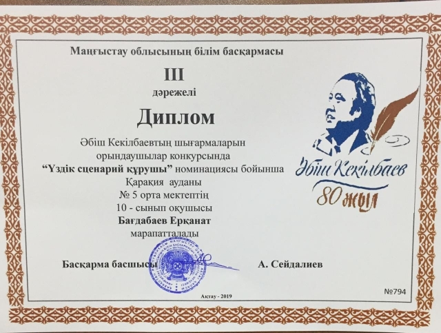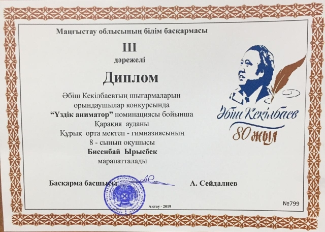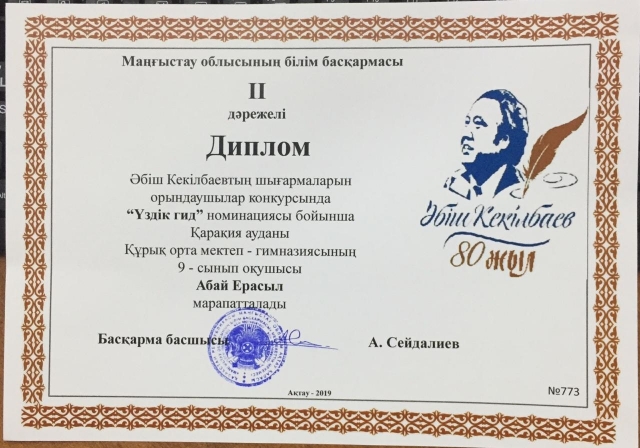 Маңғыстау облысы әкімінің стипендиясы үшін білім беру ұйымдарының дарынды оқушыларына арасында "Абыз аға-Әбіш" байқауында ауданымыздың жеңімпаз оқушылары жоғары жетістікке жетіп, ауданымыздың мерейін өсірді. № 4 орта мектебінің 11 сынып оқушысы Тәжібай Заманбек "Жас көркемсөз шебері" номинациясынан Бас жүлде, осы мектептің 11 сынып оқушысы Социал Бақытжан "Үздік оқырман" номинациясынан ІІІ орын, Құрық орта мектеп-гимназиясының 9 сынып оқушысы Абай Ерасыл "Үздік гид" номинациясынан ІІ орын, Қарақұдық орта мектебінің 11 сынып оқушысы Түзелбаева Айман ІІІ орын, № 5 орта мектебінің 10 сынып оқушысы Бағдабаев Ерқанат ІІІ орын, Құрық орта мектеп-гимназиясының 8 сынып оқушысы Бисенбай Ырысбек ІІІ орын, Құрық орта мектеп-гимназиясы 11 сынып оқушысы Кеңесова Үмітжан "Жас ақын" номинациясынан ІІІ орын, № 8 орта мектебінің 11 сынып оқушысы Жөндеш Замира ІІІ орындармен марапатталды.