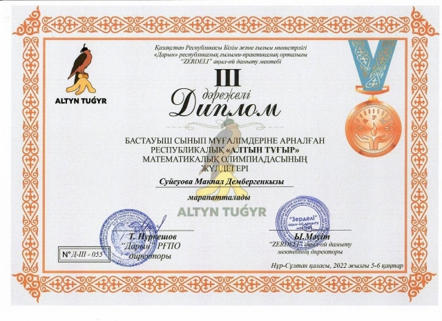 "Дарын" республикалық ғылыми-практикалық орталығы мен "ZERDELI" ақыл-ой дамыту мектебінің ұйымдастыруымен Бастауыш сынып мұғалімдеріне арналған республикалық "АЛТЫН ТҰҒЫР" математикалық олимпиадасында "№11 жалпы білім беретін мектеп" КММ-нің бастауыш сынып мұғалімі Сүйеуова Мақпал Дембергенқызы ІІІ орынды иеленді.