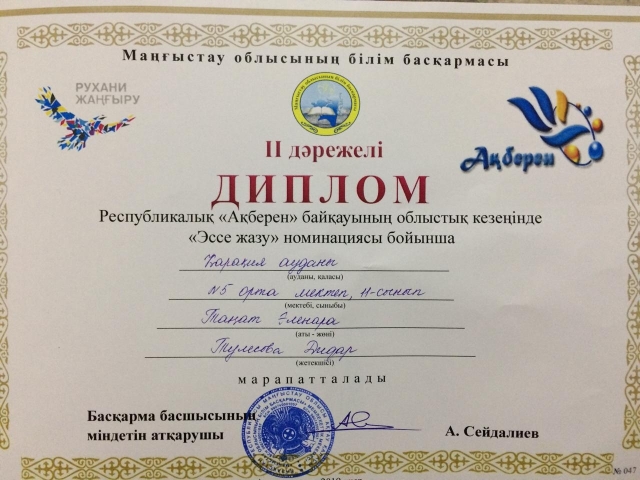 "Эссе жазу" бағыты бойынша: Таңат Эленора - 2 орын, №5 орта мектебінің 11 сынып оқушысы, жетекшісі Тулесова Дидар;