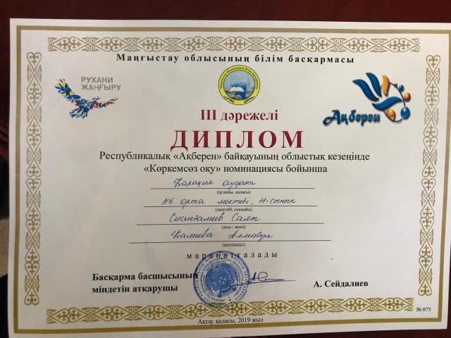 "Көркемсөз оқу" бағыты бойынша: Сисенгалиев Саят - 3 орын, №6 орта мектебіның 11 сынып оқушысы, жетекшісі Қалиева Алмагүл;