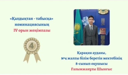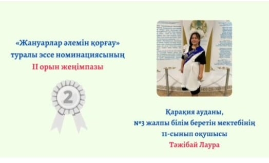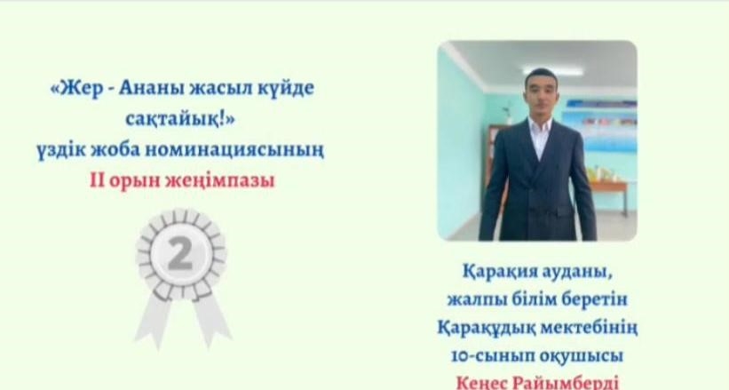 «Ғаламшарды бірге сақтаймыз» облыстық қашықтық байқауынан «Жер-Ананы жасыл күйде сақтайық» номинациясы бойынша «Жалпы білі беретін Қарақұдық мектебінің » 10- сынып оқушысы Кеңес Райымберді II орынға, «Қалдықтан табысқа» номинациясы бойынша «№4 жалпы білім беретін мектебінің» 7- сынып оқушысы Ғалымжанұлы Шыңғыс IV орынға, «Жануарлар әлемін қорғау» туралы эссе номинациясы бойынша «№3 жалпы білім беретін мектебінің» 11- сынып оқушысы Тәжібай Лаура II орынға ие болды. Байқау жеңімпаздарын жүлделі орындарымен құттықтай отырып, биіктерден көріне берулеріне тілектеспіз!
