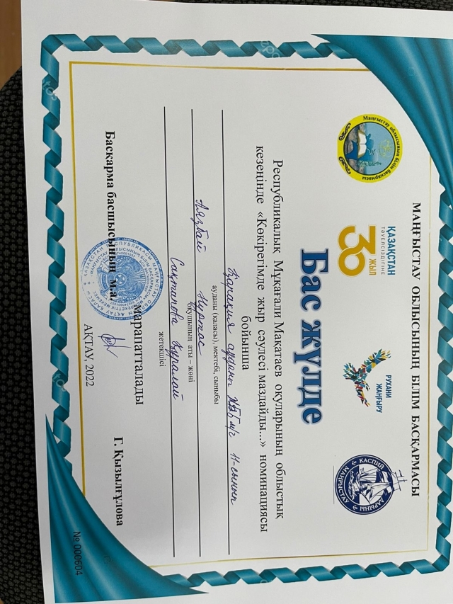 "Көкірегімде жыр сәулесі мазалайды" номинациясы бойынша ЖББМГ 11-сынып оқушысы Аязбай Нұртас бас жүлдеге ие болып, Маңғыстау облысының намысын қорғауға Республикаға жолдама алды.