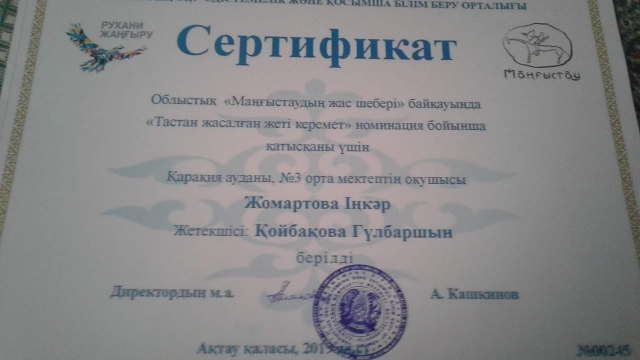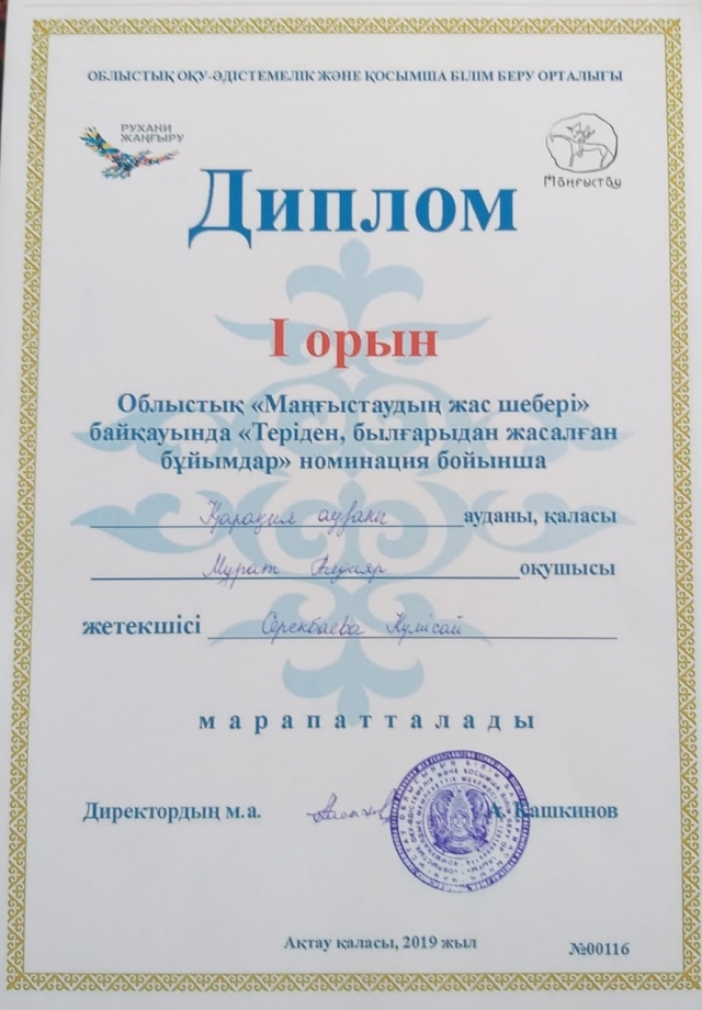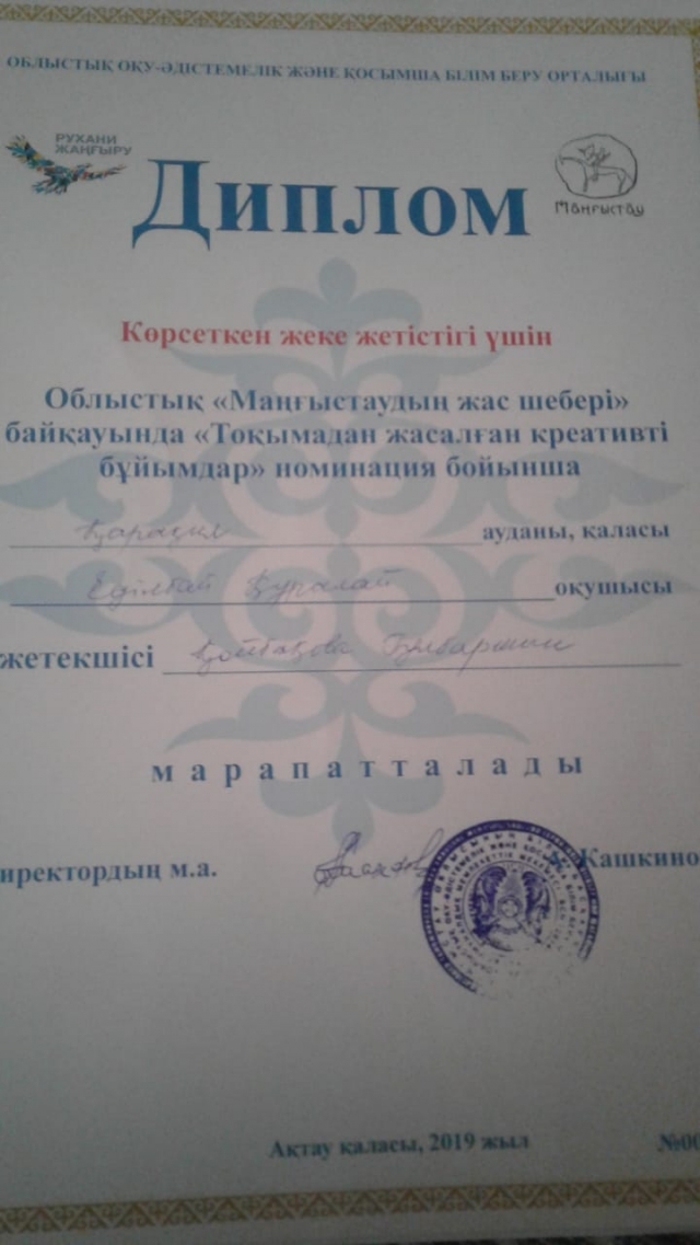 Бүгін Ақтау қаласындағы Оқушылар орталығында өткізілген облыстық «Қайырымдылық-жылы жүрекпен» атты эстафеталық жобасы аясындағы «Маңғыстаудың жас шебері» байқауында Құрық орта мектеп- гимназиясының 9 сынып оқушысы Мұрат Алдияр «Теріден, былғарыдан жасалған бұйымдар» номинациясы бойынша І жүлделі орынға ие болды, «Алтын адам» номинация бойынша Құрық орта мектеп- гимназиясының 9 сынып оқушысы Нұрқожа Жасұлан ІІІ орын, Аяпберген Жансая, Қаныбекова Динара сертификатармен марапатталды. Жетекшілері технология пәні мұғалімі Серекбаева Күмісай.«Тоқымадан жасалған креативті бұйымдар» номинациясы бойынша Құрық балалар өнер мектебінің оқушысы Ерденбай Жансая ІІ орын (жетекшісі Демесінова Гүлжайна), Жетібай балалар өнер мектебінің оқушысы Мерген Ақниет ІІ орынды (жетекшісі Алданова Зарифа) иеленді. №3 орта мектеп оқушылары Жомартова Іңкәр, Жұмахан Айгерім,Еділбай Құралай, сертификаттармен марапатталды (жетекшісі Қойбақова Гүлбаршын).