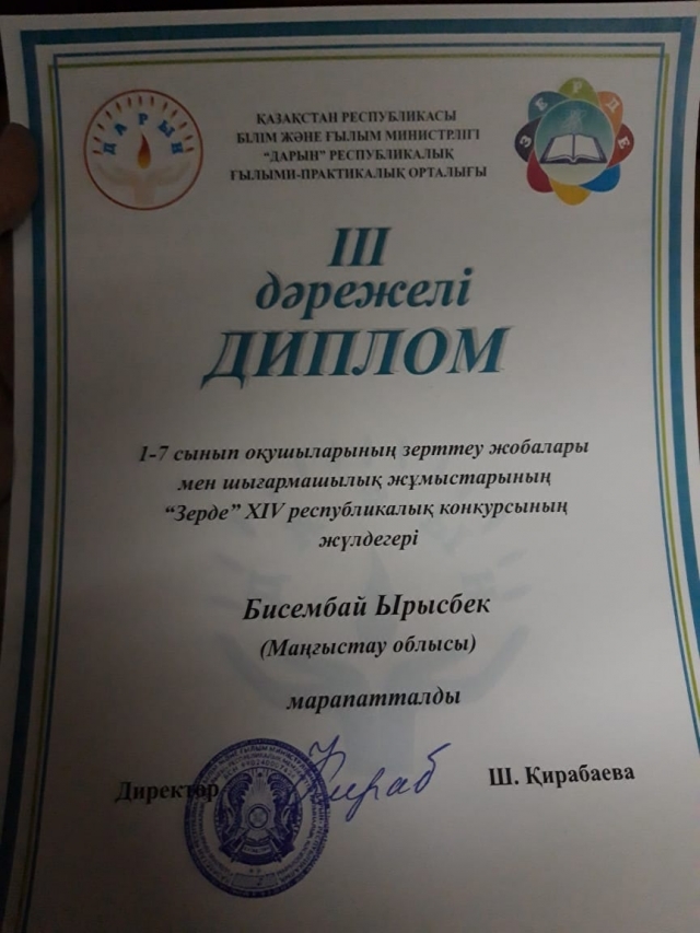 Қарақия ауданының шәкірттері 2018-2019 оқу жылындағы оқушылардың зерттеу жұмыстары мен шығармашылық жобаларының ХІV республикалық «Зерде» конкурсында топ жарды.Осы жылдың 29 - 31 қаңтар аралығында "Дарын" Республикалық ғылыми-практикалық орталығының ұйымдастыруымен "Балдәурен" РОСО базасында өткізілген 1 - 7 сынып оқушылары арасындағы "Зерде" зерттеу жобалары мен шығармашылық жұмыстардың ХІV Республикалық байқауына жолдама алған 2 оқушымыз өздерінің зерттеу жұмыстарын жоғары дәрежеде қорғап, жүлделі орындарға ие болды. Олар №1 орта мектебінің 7 сынып оқушысы Сәуірбаев Әліби І орынды иеленсе, Құрық орта мектеп-гимназиясының 7 сынып оқушысы Бисембай Ырысбек ІІІ орынды иеленіп ауданымыздың мәртебесін көтерді. Айта кету керек, 1-7 сынып оқушылары арасында «Зерде» шығармашылық жобалар мен зерттеу жұмыстарының республикалық конкурсы «Дарын» республикалық ғылыми-практикалық орталығының ұйымдастыруымен 2005 жылдан бастап өткізіліп келеді. «Зерде» конкурсының негізгі мақсаты – оқушыларды жастайынан зерттеу жұмыстарына тарту, сонымен қатар, зерттеушілік дағдыларын жетілдіру арқылы олардың интеллектуалдық шығармашылық әлеуетін арттыру, оқушылардың жас кезінен бастап шығармашылық жобалау және зерттеушілік дағдыларын дамыту болып табылады.