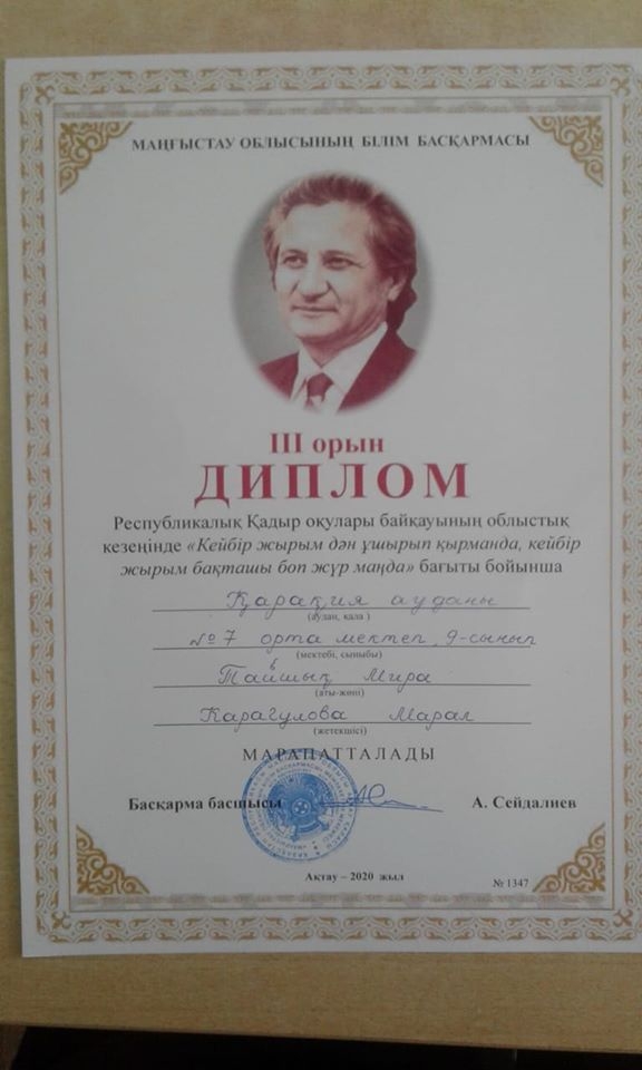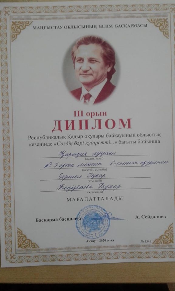 Республикалық Қадыр оқулары байқауының облыстық кезеңінде,№ 7 орта мектебінің 6 сынып оқушысы Зершал Іңкәр "Сөздің бәрі құдіретті..." бағыты бойынша жүлделі ІІІ орынды (жетекшісі Теңізбаева Ғ.) және осы мектептің 9 сынып оқушысы Тайшық Мира да "Кейбір жырым дән ұшырып қырманда, кейбір жырым бақташы боп жүр маңда" бағыты бойынша жүлделі ІІІ орындарды (жетекшісі Қаргулова М.) иеленді.