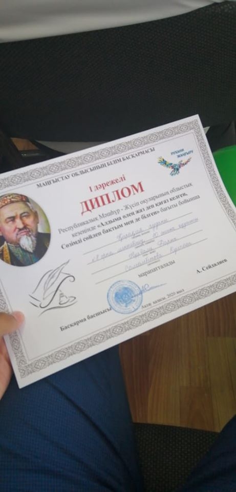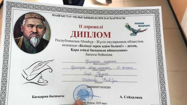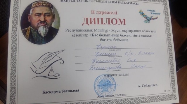 І орынмен, «Бас болып өнер білсең тіпті жақсы» бағытынан Құланды орта мектебінің 9 сынып оқушысы Құрманбай Сая (жетекшісі Башигулова Инкар) ІІ орынмен,«Білімді зерек адам болам!» - десең, Қара өзіңді басқаның айнасымен» бағытынан да Құланды орта мектебінің