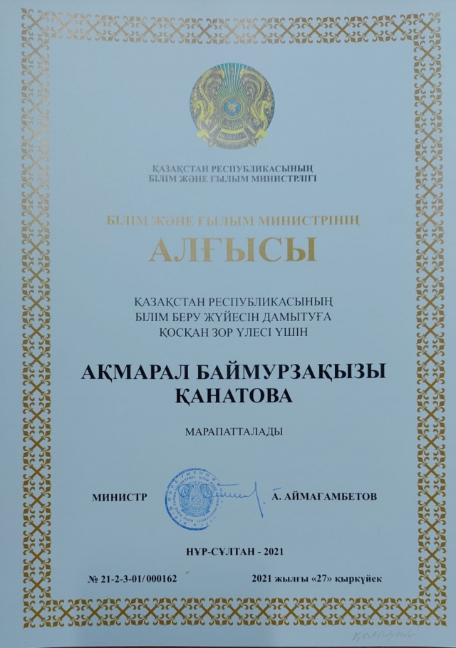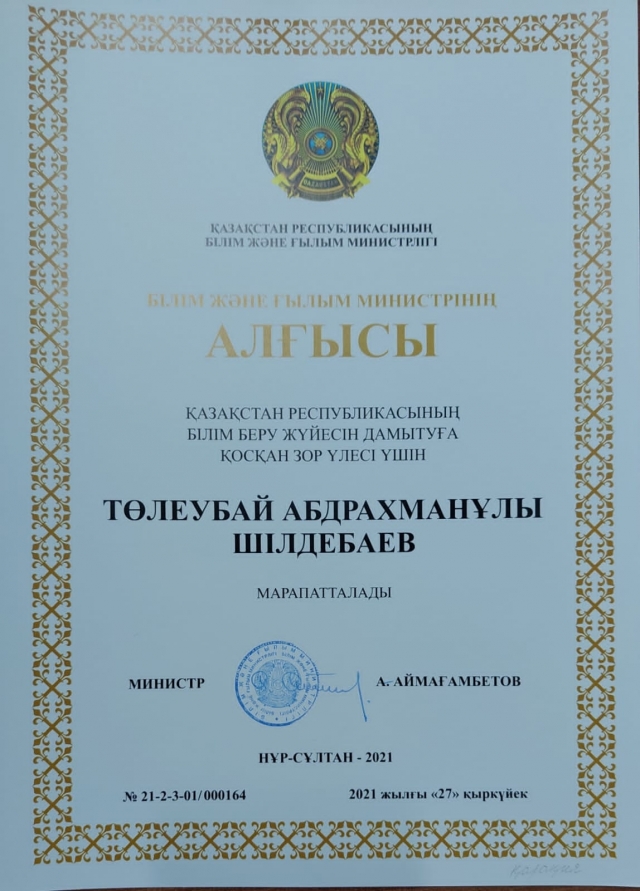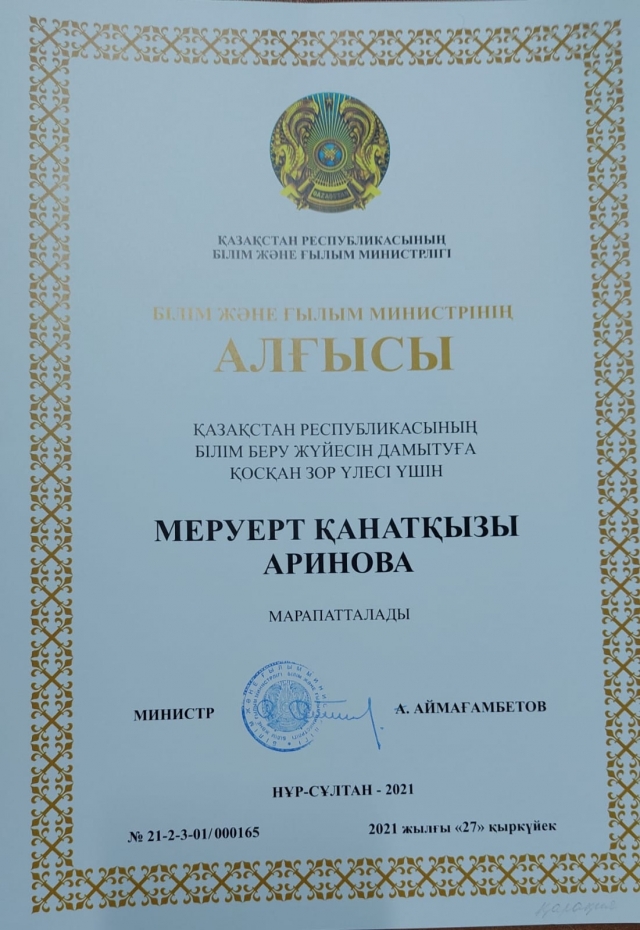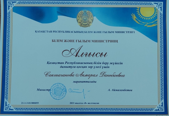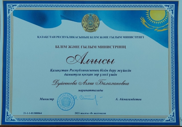 Қазақстан Республикасының Тәуелсіздігінің 30 жылдығы мерекесіне орай, Қазақстан Республикасының Білім және ғылым министрі Асхат Аймағамбетовтің Қазақстан Республикасының білім беру жүйесін дамытуға қосқан зор үлесі үшін АЛҒЫСЫМЕН ауданымыздың бірнеше ұстаздары марапатталды.